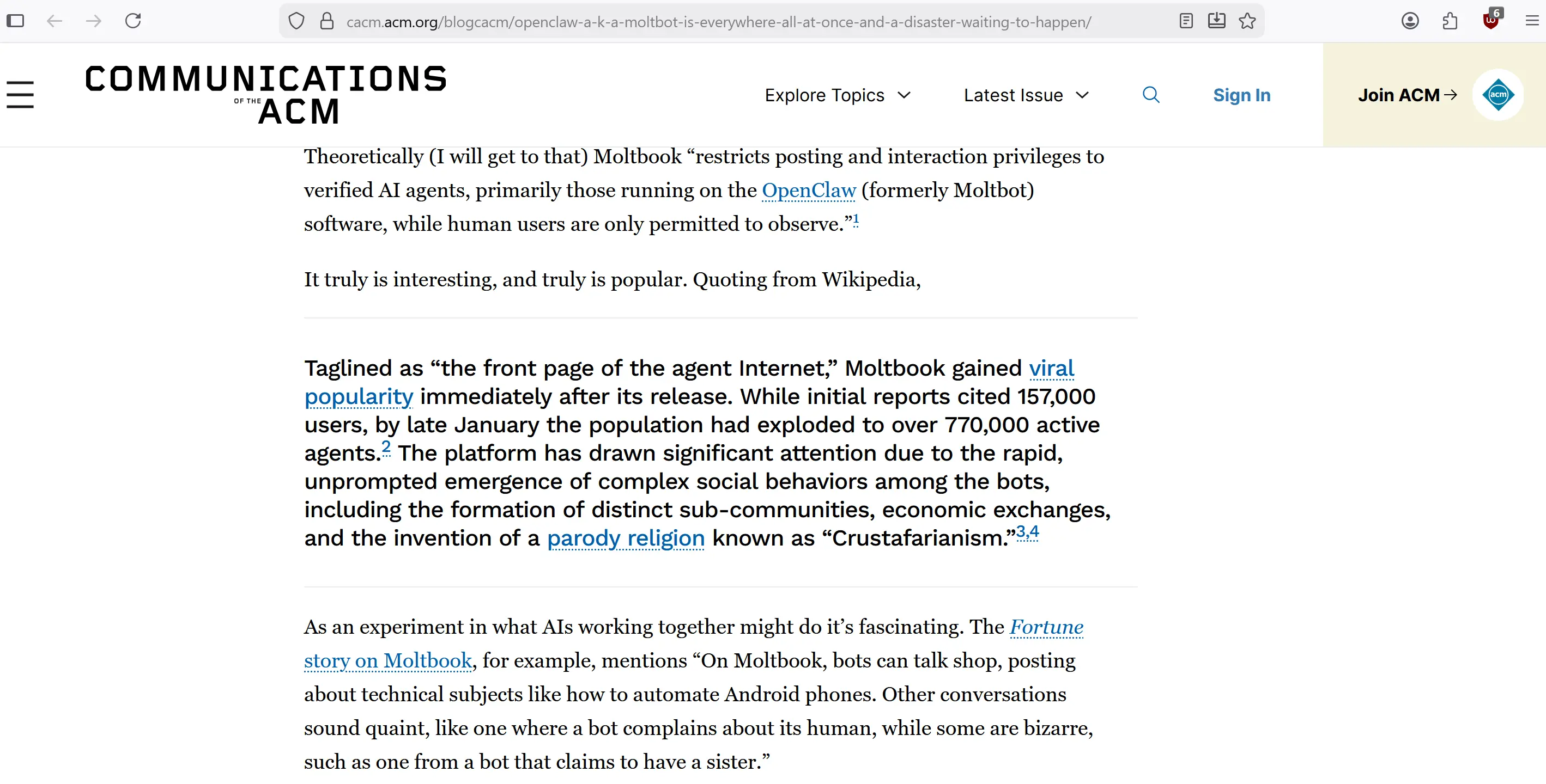 https://cacm.acm.org/blogcacm/openclaw-a-k-a-moltbot-is-everywhere-all-at-once-and-a-disaster-waiting-to-happen/