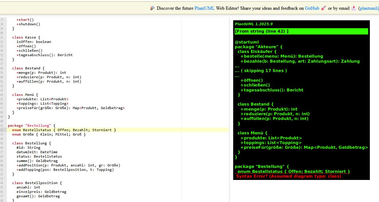 Hier ist ein sauberes PlantUML-Klassendiagramm für eine mobile Eisverkaufsstelle mit den Rollen Eiskäufer (Kunde) und Verkäufer. Du kannst den Code 1:1 in jeden PlantUML-Renderer einfügen.